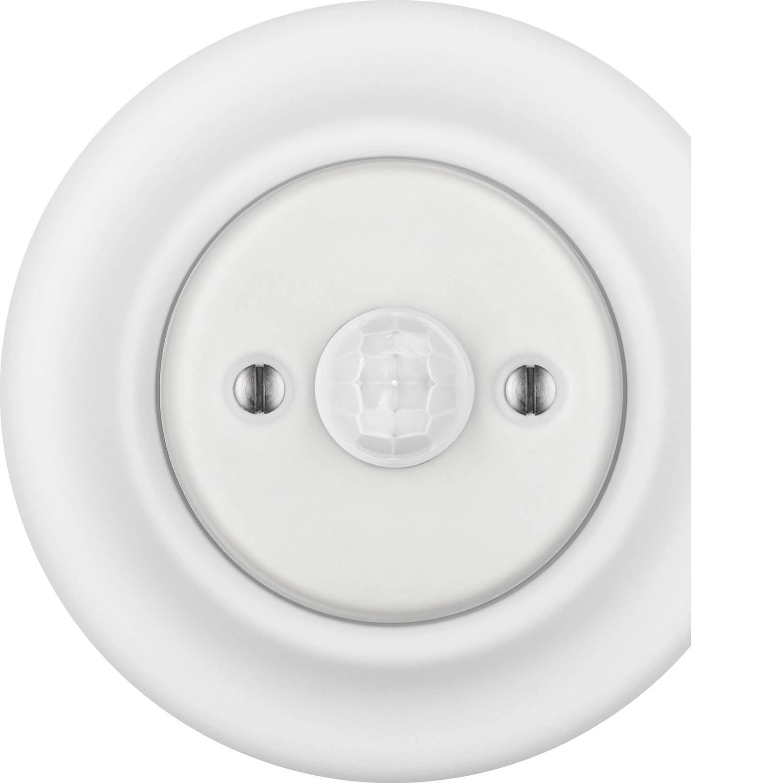 Modern bewegingssensor geïnspireerd door retro design. Met glazen oppervlak. Ontworpen in mat wit kleur. Slijt- en kleurechtheid. EG-verklaring van overeenstemming. 50 jaar garantie!